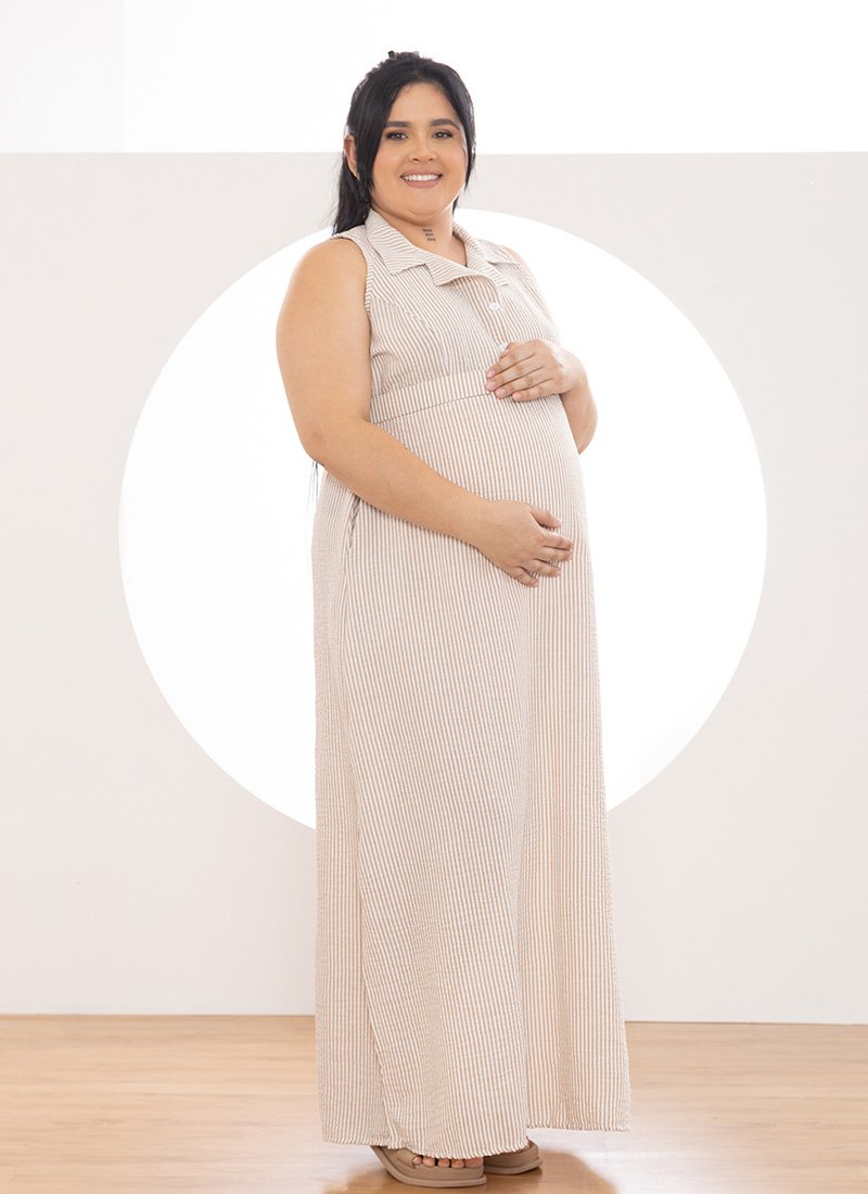 Este vestido largo en lino rayado es la combinación perfecta entre frescura, comodidad y estilo. Diseñado para mujeres embarazadas, curvy y no gestantes, su silueta amplia con corte fluido se adapta al cuerpo sin marcar, ofreciendo libertad de movimiento y un ajuste favorecedor en todas las etapas.